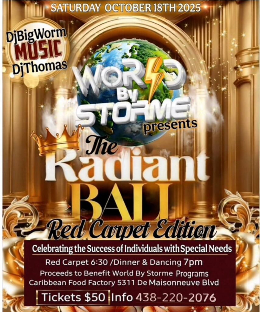 On Saturday, October 18th, 2025, Montreal is set to host an unforgettable celebration: The Radiant Ball – Red Carpet Edition, presented by World By Storme. This inspiring event is dedicated to honouring the achievements of individuals with special needs, promising a memorable evening filled with elegance, music, and Caribbean hospitality.
